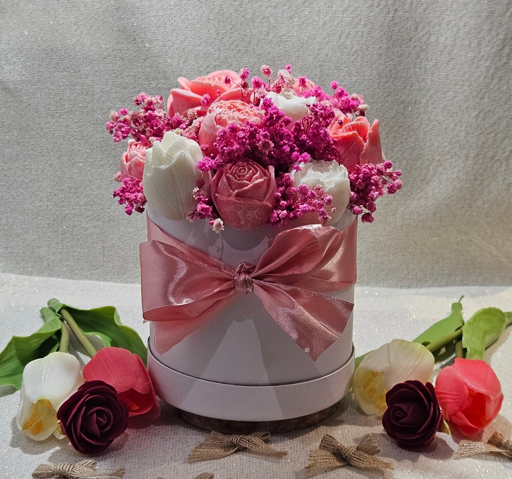 Nos bouquets de fleurs en fondants parfumés sont entièrement confectionnés à la main, avec des cires végétales et des fragrances de qualité.
