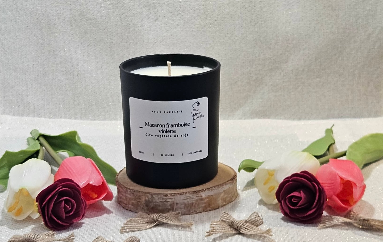 Laissez-vous séduire par la gourmandise délicate de notre bougie parfumée Macaron Framboise Violette.