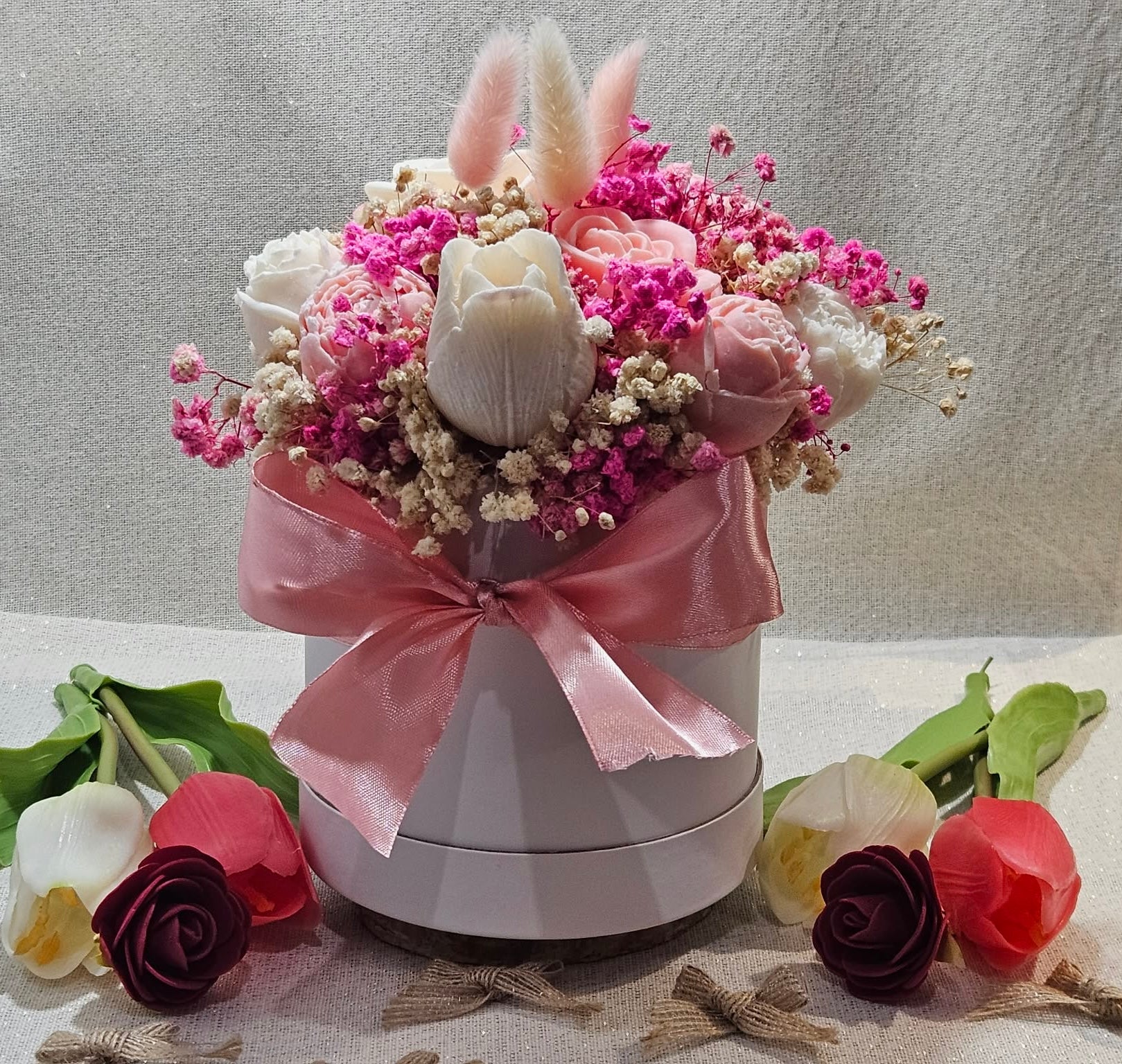 Nos bouquets de fleurs en fondants parfumés sont entièrement confectionnés à la main, avec des cires végétales et des fragrances de qualité.